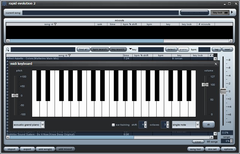 Установив и запустив Rapid Evolution, нажми на кнопку «piano». На экране появится эмулятор клавиатуры (см. слева, нажми на картинку, чтобы ее увеличить). Запусти на вертушке или другом источнике звука композицию, тональность которой ты хочешь определить. Обрати внимание: питч при этом должен стоять на нуле!